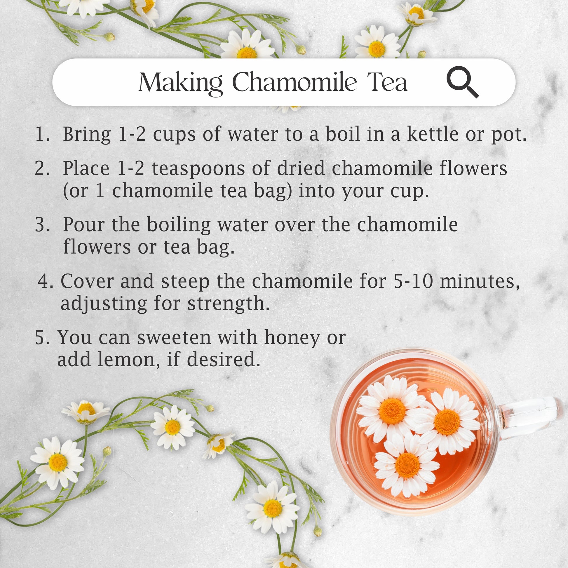 The antioxidants in chamomile help reduce dullness and bring out a natural glow. Regular intake or topical use may lighten blemishes, dark spots, and under-eye circles over time.