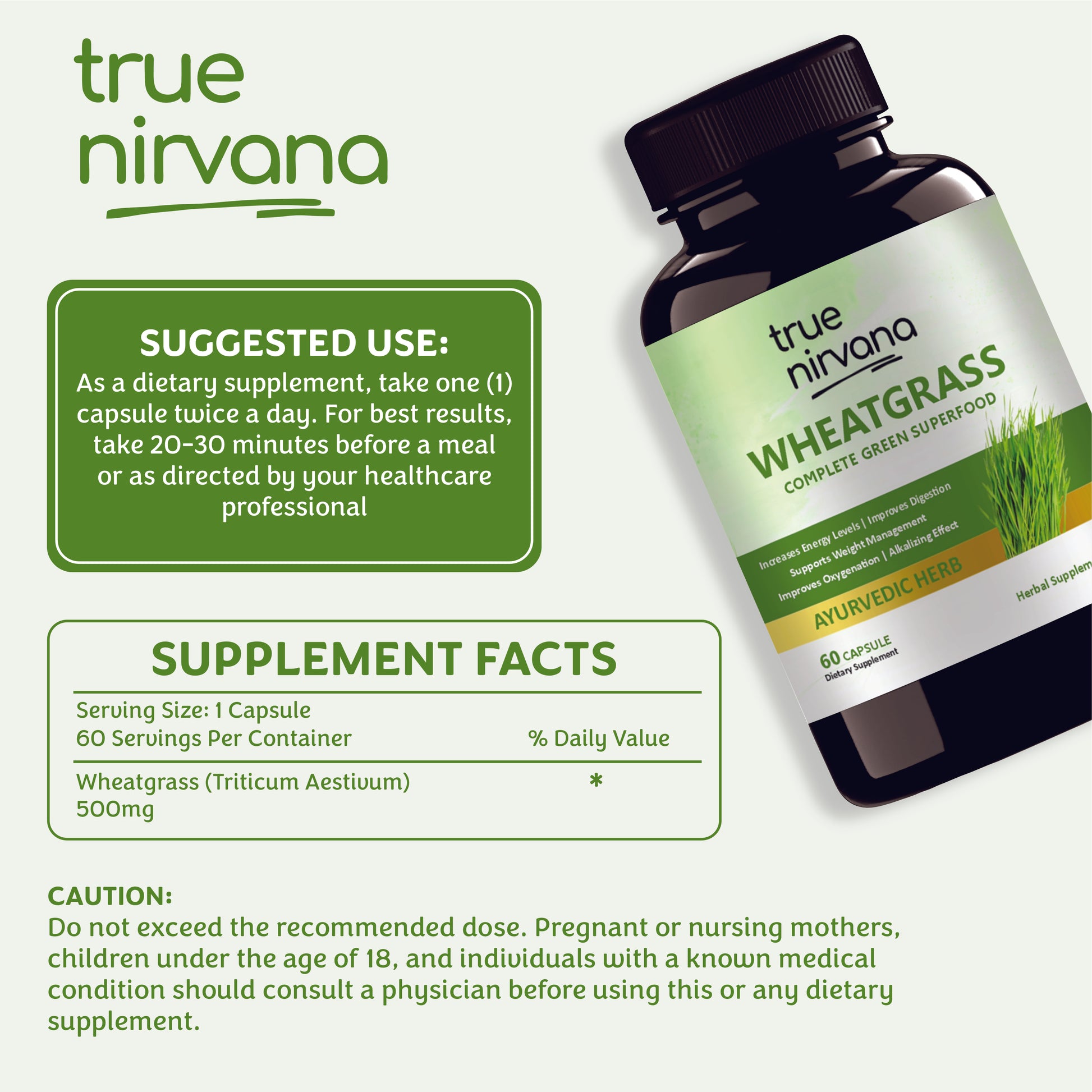 TrueNirvana Wheatgrass Capsules are made from pure wheatgrass extract, a natural superfood packed with chlorophyll, vitamins, minerals, and antioxidants. Known as a powerful detoxifier, wheatgrass helps cleanse the body, improve digestion, and boost immunity.